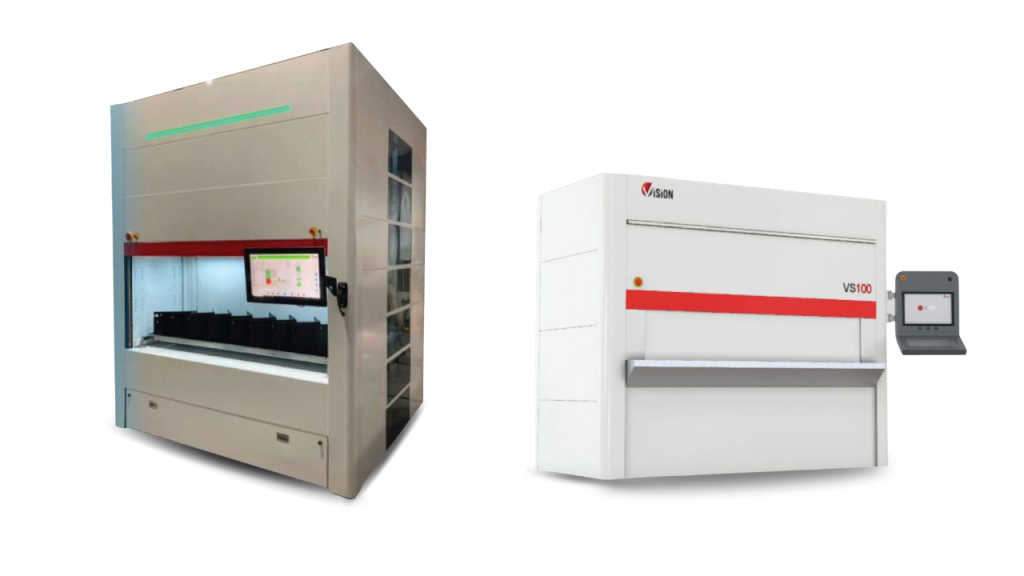 It works like a Ferris wheel. Individual trays rotate internally until the system brings one tray to the operator. This reduces walking time and makes the retrieval process faster.