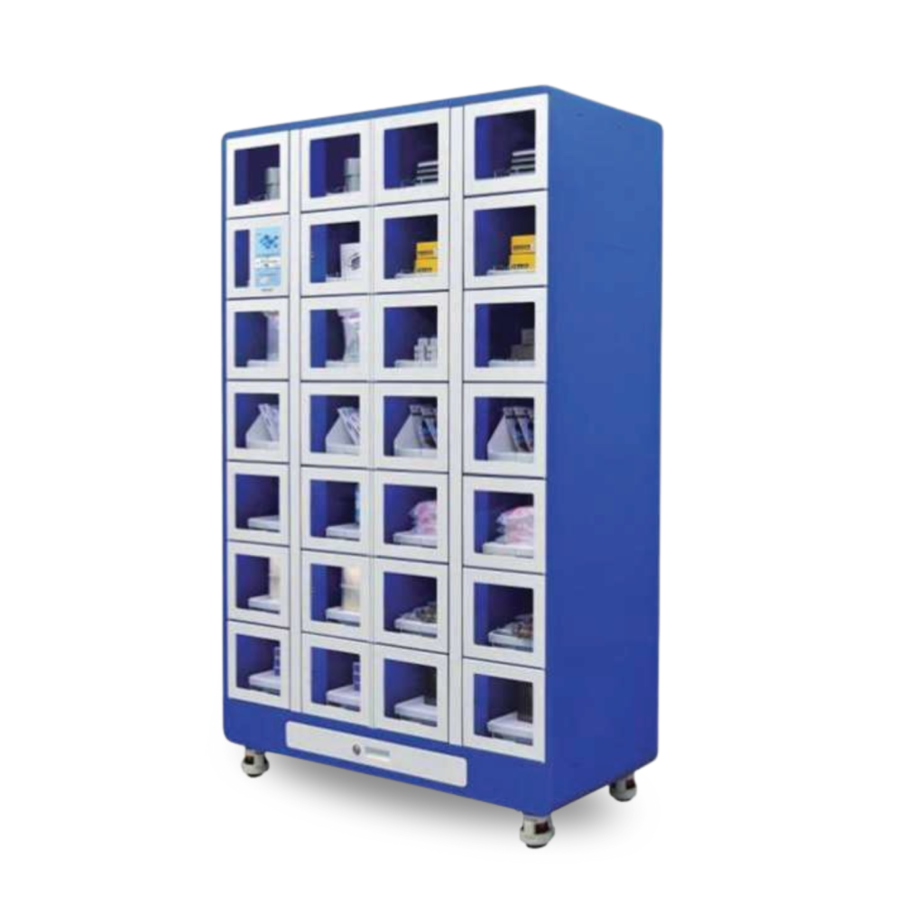 Locker-type vending machines use electronically locked compartments (instead of a key) to secure items. Products are stored in individual “lockers” and are dispensed only after an authorised user unlocks the correct door. This format is ideal for high-value, bulky, or safety-critical items such as PPE, tools, or specialised components.